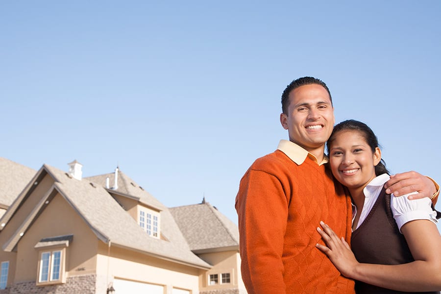 Couple standing in front of newly purchased home